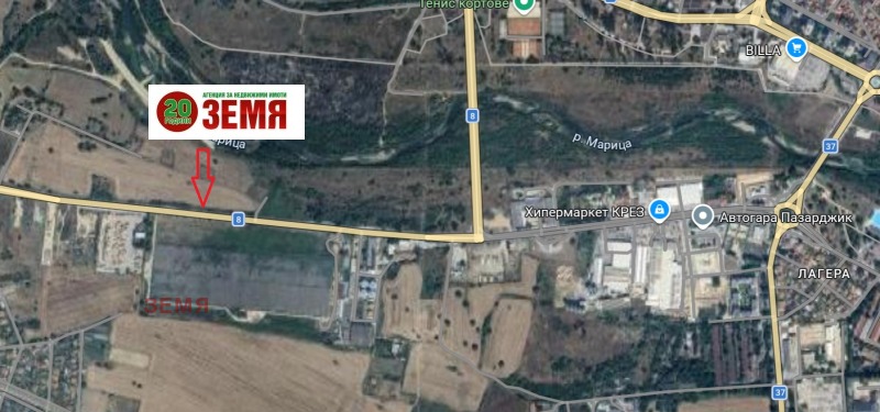 Имота е с лице 100метра на пътя за с. Звъничево, веднага след изхода от гр. Пазарджик. Подходящ за търговска, складова, производствена дейност и паркинг. Възможност за закупуване на съседен парцел.