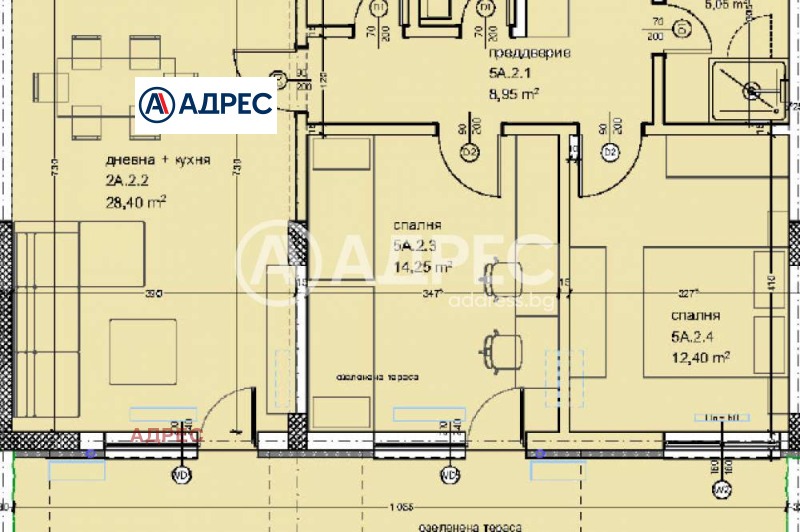 Тристаен апартамент на партерен етаж, състоящ се от дневен тракт, две спални, баня с тоалет, тоалет, килер, предверие, две тераси и в допълнение озеленена тераса 30 кв. м.