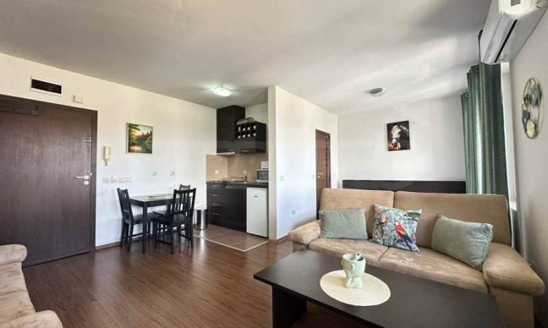 Отлично организирано пространство, включващо самостоятелна кухненска зона с кът за хранене, просторна дневна с два дивана, гардероб, телевизор, голяма спалня и баня с душ кабина.