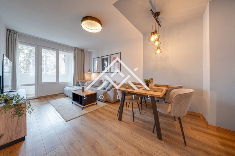 Апартаментът е със застроена площ от 66, 78 кв. м и е след ремонт, с подменена дограма и обновен интериор. Разпределението включва дневна с кухненски бокс, две спални, едната от които е преходна, антре, баня, отделна тоалетна и вътрешно складово помещение тип килер. Терасата към кухнята е усвоена и интегрирана към жилищната площ, което разширява работната зона и прави пространството по-функционално.