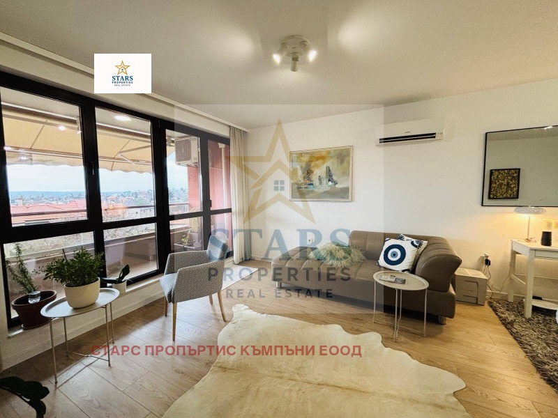 Апартаментът е напълно обзаведен с много вкус и внимание към всеки детайл. Състои се от просторна и паморамна дневна -30 кв. м , две просторни спални, баня с тоалетна, килер, покрита панорамна тераса, входно антре с вграден гардероб. Към имота има и избено помещение. Изключително топъл, светъл и уютен апартамент, намиращ се в комплекс с фитнес, басейн и сауна.