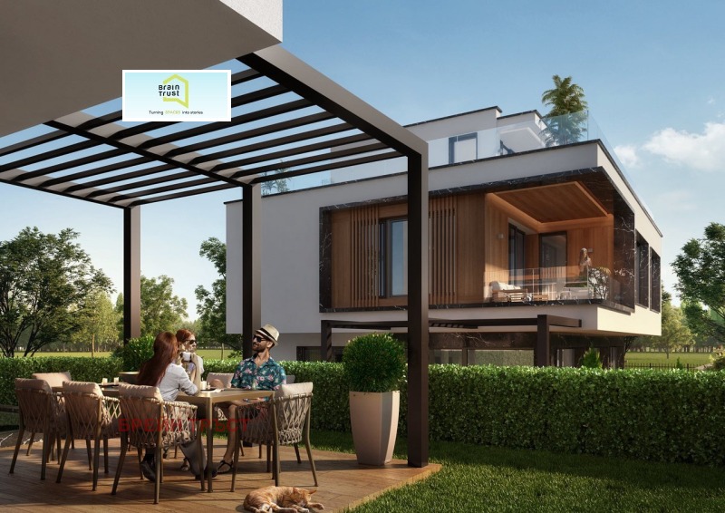 Разпределението на къщата е функционално и удобно. На първия етаж се намира голяма и светла дневна с кухня и просторна трапезария. На втория етаж са разположени три големи спални, като мастер спалнята разполага със собствен дрешник и баня. На същия етаж има още една баня за другите две спални, както и отделно перално помещение. На третия етаж се намира впечатляваща покривна тераса с морска гледка, към която има допълнителна баня и малка кухня, подходяща за удобство при използване на терасата.