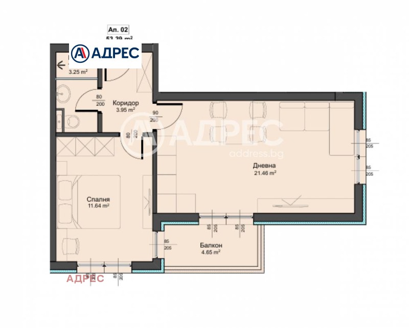 Жилището разполага с площ от 56 кв. м. разпределена в коридор, дневен тракт с кухненски бокс, спалня, балкон, баня и тоалетна.