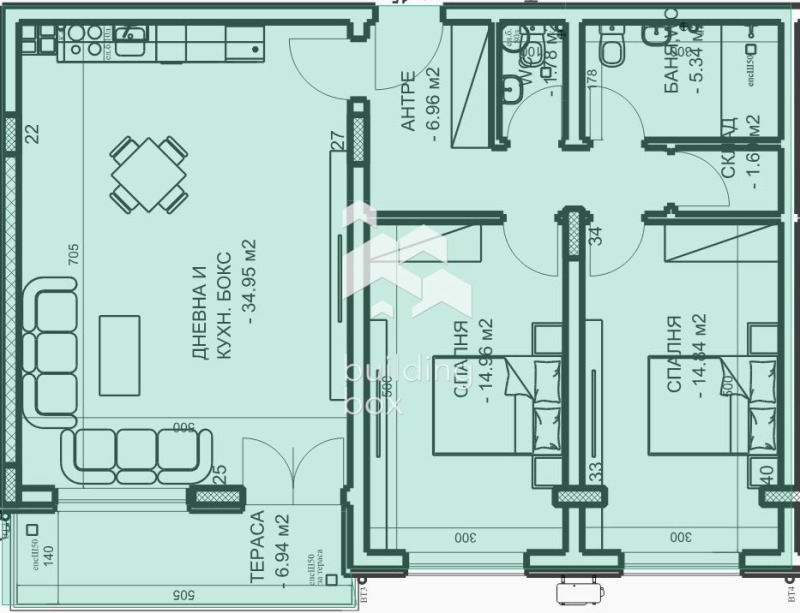 РАЗПРЕДЕЛЕНИЕ: Просторна всекидневна с кухненски бокс с площ 34, 95 кв. м, две спални с площ около 15 кв. м, антре, баня с тоалетна, отделна тоалетна и тераса.