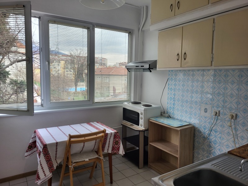 УДОБНО МЕСТОПОЛОЖЕНИЕ, ИЗЦЯЛО ЮЖЕН, ВЪТРЕШЕН И ТОПЪЛ АПАРТАМЕНТ, СЛЕД ХУБАВ ОСВЕЖИТЕЛЕН РЕМОНТ, НАПЪЛНО ОБЗАВЕДЕН. Апартаментът е разположен на четвърти етаж от седеметажна масивна монолитна жилищна сграда. Имотът е със застроена площ от 43 кв. м с развити в него входно антре, една стая, самостоятелна хубава кухня, баня със санитарен възел и една тереса. Вътрешно състояние: ламиниран паркет, шпакловка и латекс; Баня със санитарен възел-фаянс, теракота, санитарен фаянс; Дограма-PVC дограма. Обзавеждане-цялостно обзавеждане с мека мебел, кухненски шкафове, бяла техника.