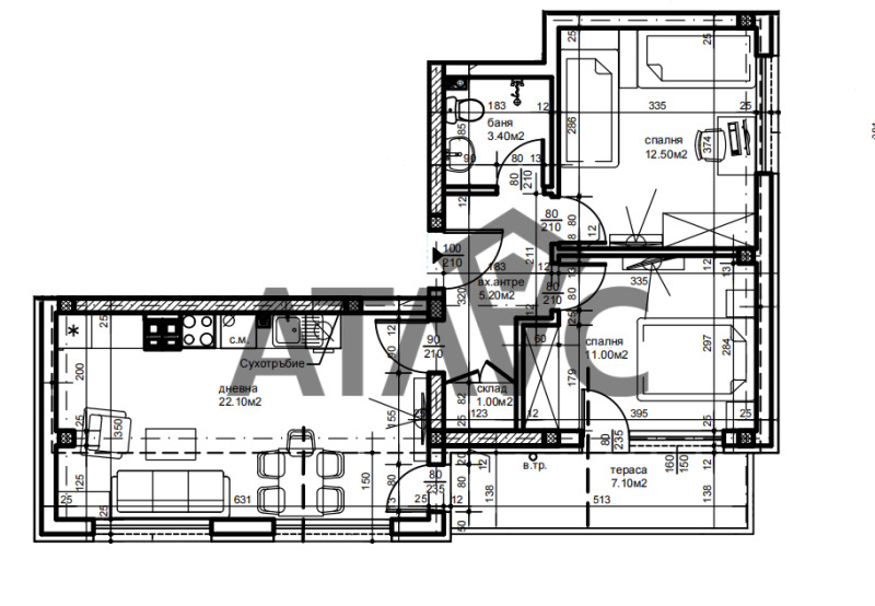 Жилището разполага с дневна с кухненско помещение, ДВЕ спални, баня с тоалетна, входно антре, склад и тераса.