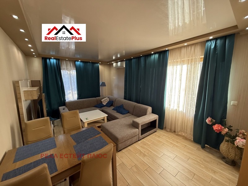 Жилището се състои от хол с кухненски бокс, две спални, гардеробна, килер, баня с тоалетна, две тераси и таванско помещение. Апартаментът е след ремонт и напълно обзаведен, готов за нанасяне.