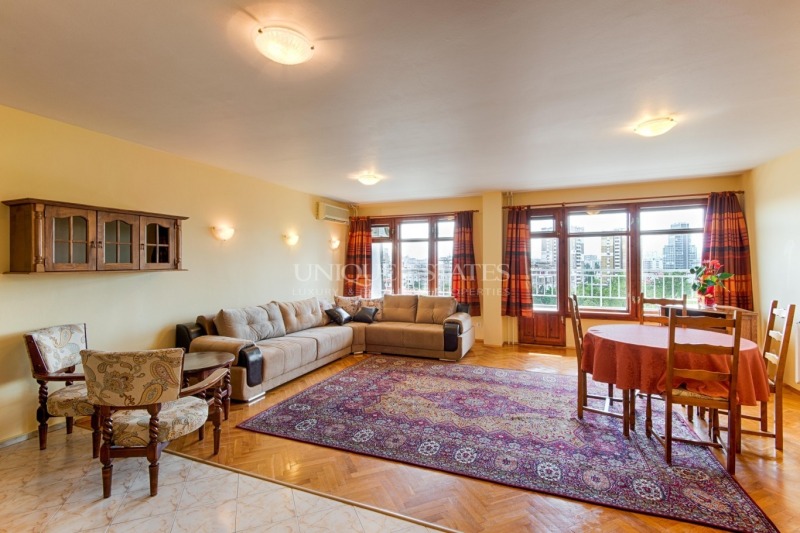 Дневната е с югоизточно изложение и гледа към Витоша. Панорамата от балкона към хола е прекрасна. Спалните са тихи, слънчеви и също с гледка към oзеленen вътрешен двор и планината. Изложението на спалните е югозапад. Има и балкон към тях. Жилището е с хубава, просторна баня, самостоятелна тоалетна за гости и мокро помещение.