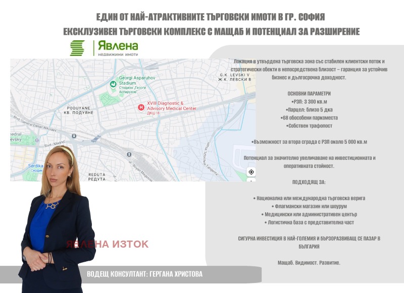 Не пропускайте тази рядка възможност за сигурна инвестиция с мащаб, локация и потенциал. За повече информация и организиране на оглед се свържете с отговорния консултант по офертата Гергана Христова.