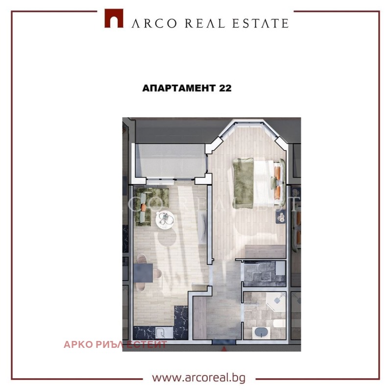 Разпределение: Входно антре, дневна с кухненнски бокс / 20. 26 кв. м. /, спалня / 17. 01 кв. м. /, баня с тоалетна / 4. 37кв. м. /, тераса.