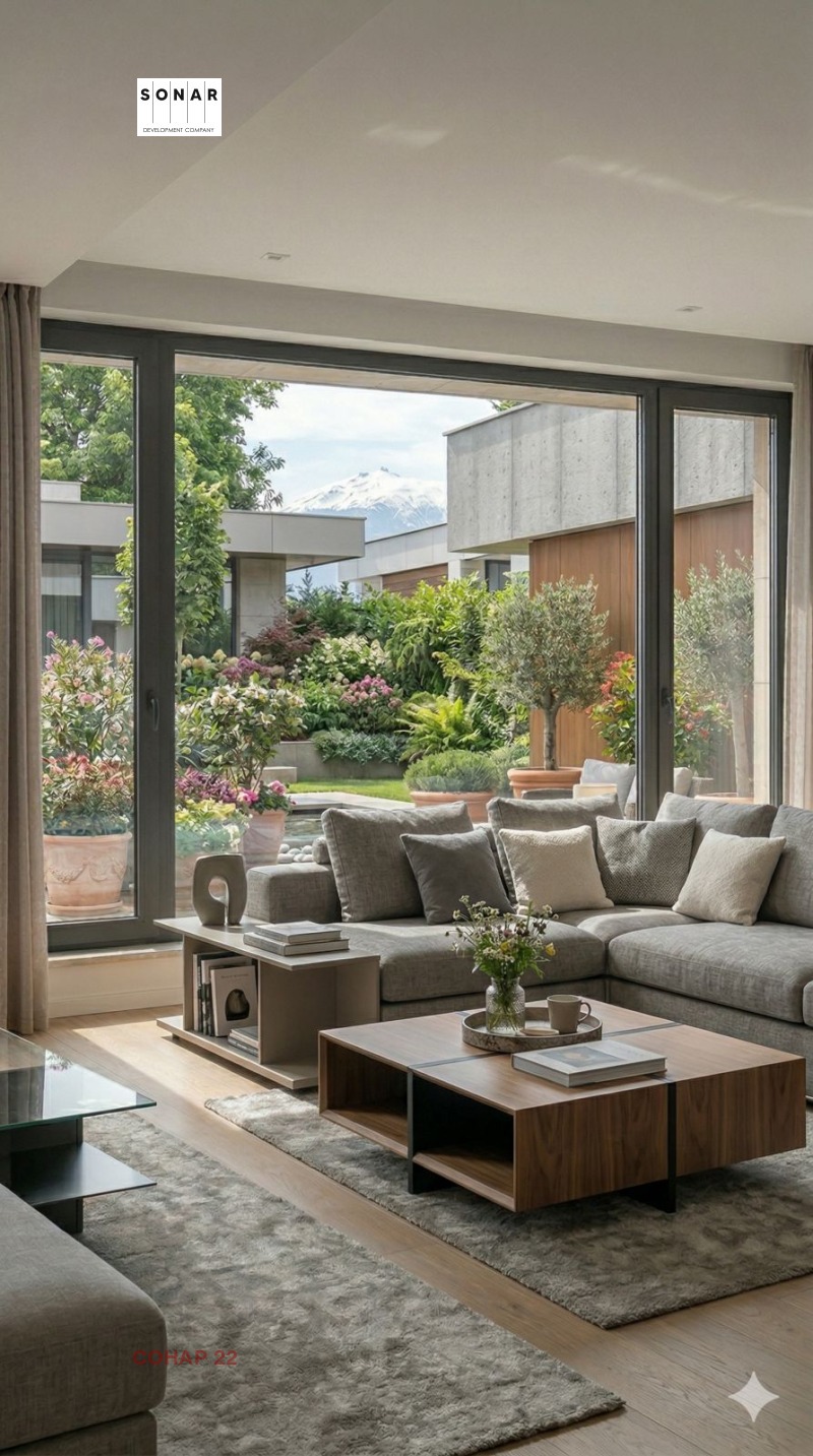 Жилище с 3 спални, всяка от които със самостоятелна баня, просторна дневна и кухня с илаз към веранда и собствен двор от 152 кв. м. към жилището. Сградата е на 3 етажна и предлага уединението на къща в полите на Витоша. 2 БРОЯ ПОДЗЕМНИ ПАРКОМЕСТА В ОПИСАНТА ЦЕНА !!! На 2 минути от Бизнес парка в Младост, Геритидж парк , РИНГ Мол и ИКЕА. Проектът е със срок на изпълнение 24 месеца, жилищата ще бъдат завършени на ниво подова замазка и фина шпакловка в помещенията, монтирани входни врати. дограма със 'секюрити' обков, троен стъклопакет, седемкамерна с армирано външно стъкло . Монтиран тръбен път за климатици. По желание на купувачите допълнително се предлага и изпълнение на отоплителната инсталация с термопомпа по индивидуален проект. Фасадата е окачена, вентилируема, с каменна вата и HPL плоскости. Гаражите са завършени на ниво шлайфан бетон и латекс.
