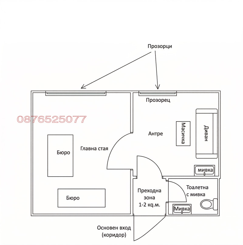 Площ 28 кв. м. , разпределени в главна стая с две бюра, антре с удобно диванче и малка масичка, санитарен възел и отделно помещение с тоалетна.