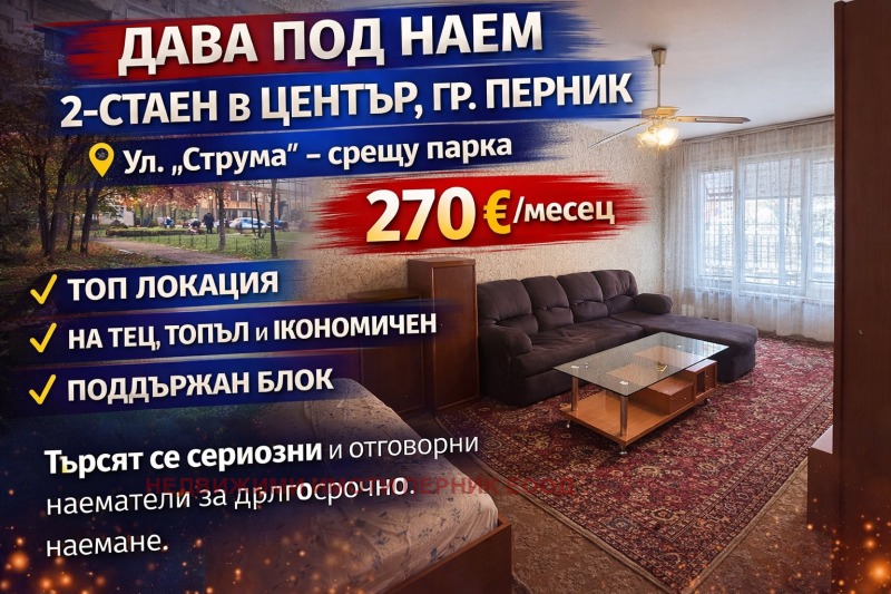 ➡ ️ Предлагаме под наем топъл и уютен двустаен апартамент в централната част на гр. Перник, на ул. Струма , срещу парка локация, която съчетава удобство, комуникации и всичко необходимо на пешеходно разстояние.
