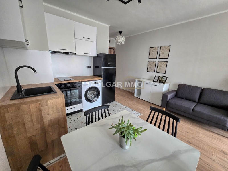 Студиото се продава с цялото налично обзавеждане, до ключ: напълно оборудвана баня, вградена кухня с ел утреди: котлони, абсорбатор, фурна, хладилник и пералня, маса за хранене с 4 стола, диван, легло, гардероб, етажерки, скрин. Всичко е ново, в гаранция.
