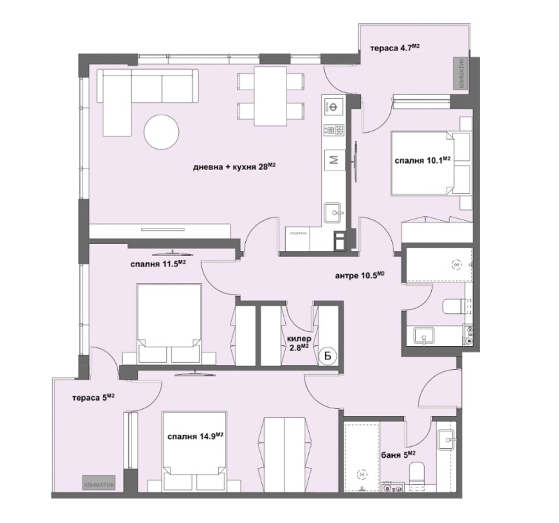 Сградата е изпълнена в съответствие с най-високите стандарти в жилищното строителство. Използаните материали са най-висок клас. Комплексът разполага с паркоместа, всяко от което ще бъде с ограничен достъп. Междублоковото пространство ще бъде озеленено с осветени алеи и фонтани.