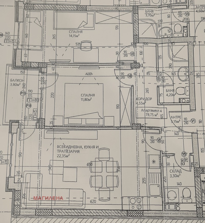 94. 89кв. м. , със следното разпределение: хол с бокс, 2 отделни спални, баня-тоалетна, антре, склад и балкон.