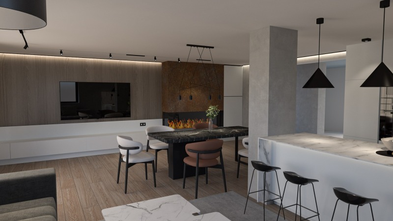 -Входно антре с гардероб - /10кв. м. /, дневна с кухня и трапезария /70 кв. м. /, три бани, две мокри помещения, две тераси /45 и 50 кв. м. /