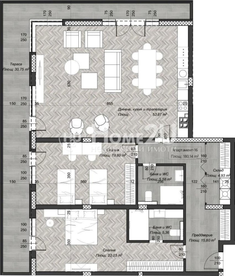 входно антре, хол + кухненски бокс 53, 87кв. м. , две спални (едната тип енсюит), още една баня с тоалетна, склад, тераса 30, 75кв. м.