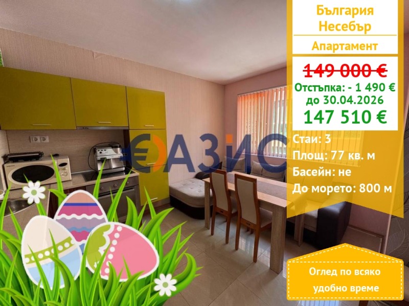 Предлагаме за продажба уютен двустаен апартамент, разположен в модерна жилищна сграда в един от най-перспективните райони на Несебър квартал Черно море. Жилището е просторно, светло и функционално, с две тераси, санитарен възел, напълно обзаведено и оборудвано с техника. Имотът е в отлично състояние и готов за нанасяне без необходимост от допълнителни инвестиции.