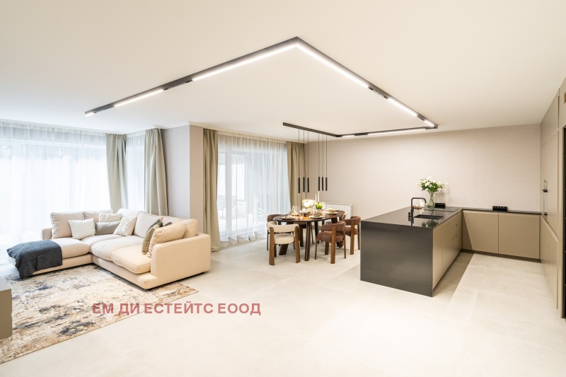 Имотът е с обща площ 198кв. м, от които 53кв. м е двор, завършен по индивидуален дизайнерски проект с висок клас материали, светъл и топъл апартамент, готов за нанасяне. Използвани са естествени материали, напълно оборудван с електроуреди Bosch, пералня и сушилня Bosch, ключове и контакти Bticino. Отоплението е решено чрез индивидуална система от газов котел Bosch и алуминиеви радиатори, има и вградени климатици Mitsubishi Heavy Industries във всяко помещение, бойлер.