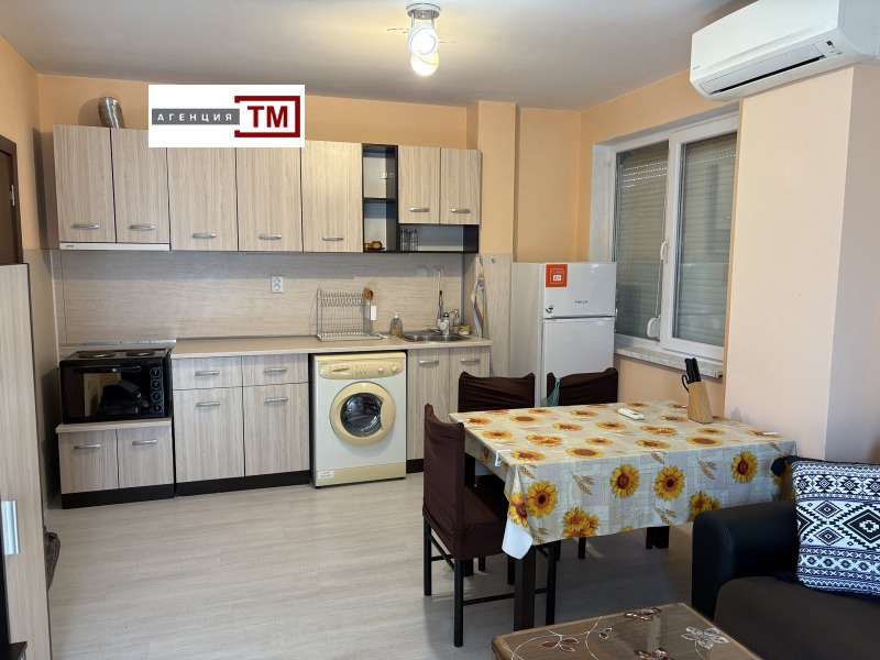 ТМ ИМОТИ отдава под наем апартамент, състоящ се от просторна дневна с бокс, две спални, без преход, баня с тоалетна, антре и тераса. Изложение юг - изток, среден етаж в нова сграда с луксозни общи части. Имотът е обзаведен и оборудван с всичко необходимо за комфортно пребиваване. Възможно е да се отдаде за наем от 300евро при ползване на дневната с 1 спалня. Локацията е изключително комуникативна, в близост до голям супермаркет, училища, детски градини и спирки на градския транспорт.