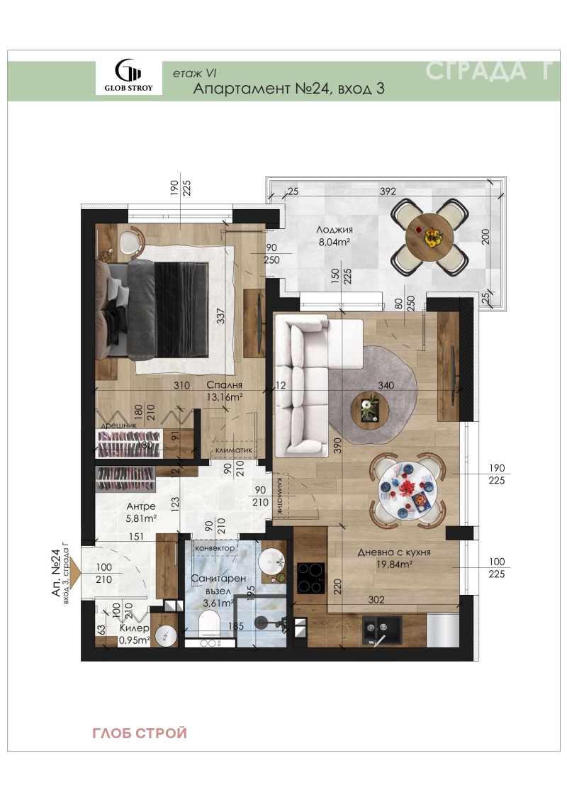 Ситуиран в сграда В , вход 3 , ап. 24 - на шести жилищен етаж с изток -север. Състои се от просторна дневна, спалня, баня с тоалетна, килер, тераса. Жилището е с обща площ 69, 92 кв. м. , от които ЗП 61, 13 кв. м.