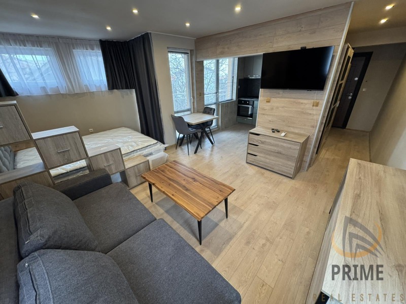 Модерно обзаведен едностаен апартамент под наем, разположен в центъра на кв. Сарафово. На 2-ри жилищен етаж.