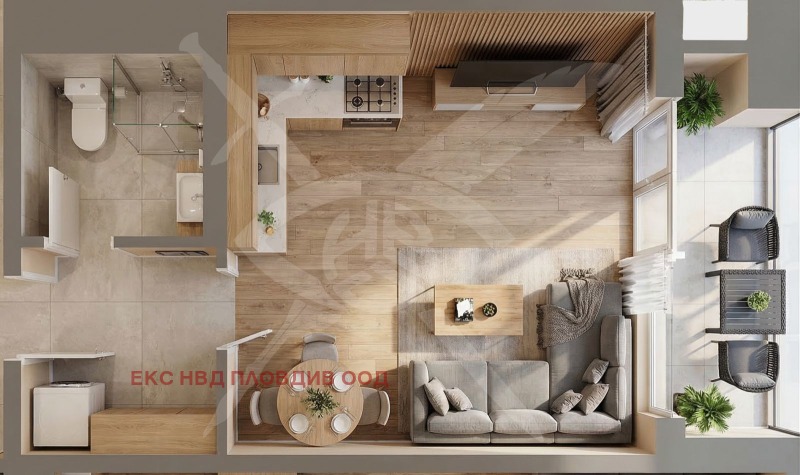 РАЗПРЕДЕЛЕНИЕ: Жилището се разгръща върху 39 кв. м. добре организирано пространство, включващо приветливо антре, практичен килер, баня с тоалетна и светла всекидневна с кухненски бокс, която естествено преминава към тераса.