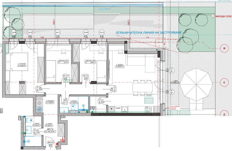 - Сградите заемат едва 30% от площа на имота, като се предвижда озеленен двор за общо ползване с детска площадка.