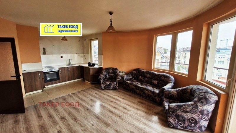 Ексклузивно в 'Такев' ЕООД - Тристаен апартамент в сграда с акт 16 от 2016г. на улица 'Чавдар Мутафов' в близост до бул. 'Филип Кутев' - на тихо, но комуникативно място с отлични гледки. Състои се от : хол с кухненски бокс, преходен за една стая, втора самостоятелна стая, баня с тоалетна + втора баня с тоалетна с място за пералня/сушилня към преходната стая, голям балкон пред хола. Квадратура с общи части по площообразуване - 97. 88 кв. м, застроена площ - 84, 61 кв. м. , отделно мазе в сутерена - 1, 7 кв. м. Имотът може да бъде ползван или отдаван под наем в този си вид или след освежителен ремонт , като двете бани са в добро състояние на плочките (за леки ремонти), ламинат - за смяна, стени и тавани - за освежаване. Има инсталация за топла вода и отопление (радиатори и лири), но трябва да се постави ново газово котле. Огледи - с ключ!