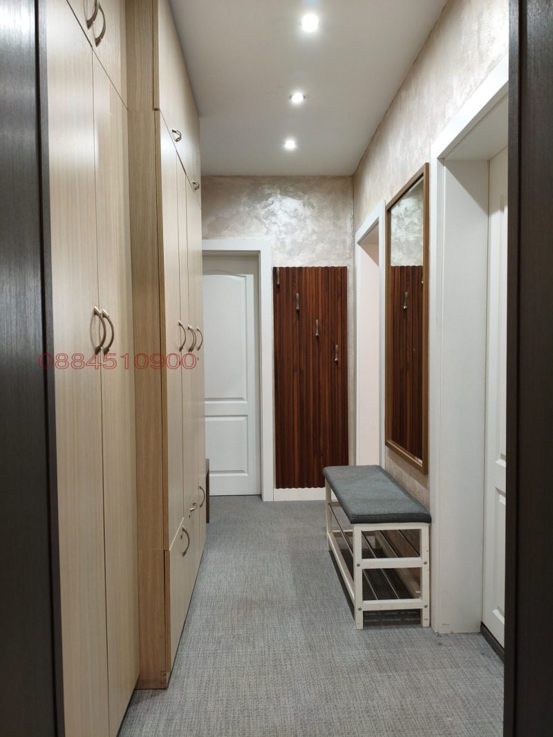 Апартамент с южно изложение, състои се от два коридора , хол, самостоятелна кухня, детска стая, родителска спалня, баня с тоалетна отделно мокро помещение с отделна втора тоалетна. Мазе 4кв ситуирано на 9ти етаж. изцяло ремонтиран с подновени инсталации и тръби. Общи части с контрол на достъпа, асансьори с чип. Продава се с цялото налично обзавеждане, оборудван с всички електроуреди необходими за едно домакинство. Обявата е за частни лица без комисион. Всички документи са налични и изрядни. При сериозен интерес цената би могла да се коментира в рамките на разумното. Много комуникативно място в близост до градски транспорт, свободно паркиране. В непосредствена близост до новия ритейл парк на бул. Никола Мушанов.