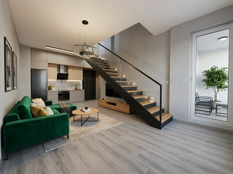 Етаж1 - Входно антре, просторен дневен тракт с кухненски кът, спалня, общ балкон за двете стаи и баня с тоалет.