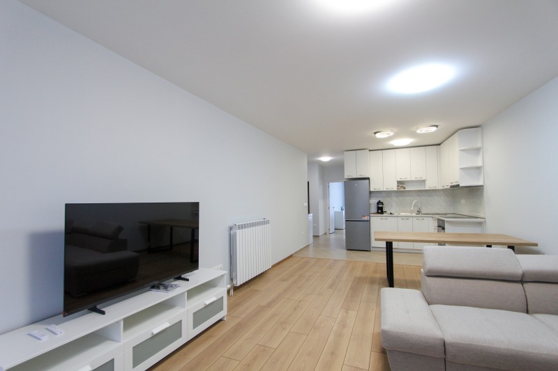 - Разположен на втори етаж от шест , имотът е чисто новообзаведен и очаква своите първи обитатели. Състои се от голяма дневна с кухненски бокс и трапезария / над 30 кв. м. / , два санитарни възела , две самостоятелни спални , както две тераси с чудесен изглед. Възможност за наемане на подземен гараж за два автомобила. Луксозни общи части с контролиран достъп и видео наблюдение.