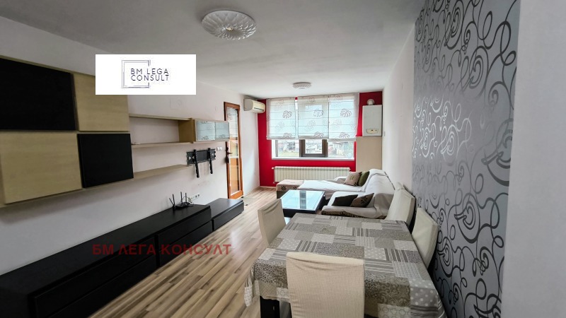 Предлагаме светъл, топъл и много функционален тристаен апартамент с обща площ от 106, 15 кв. м. и чиста площ от 90, 23 кв. м. Състои от антре с коридор, в края на който е обособено мокро пространство за пералня и сушилня, дневна с кухненски кът с обща площ от 29, 37 кв. м. , две спални - 13 кв. м. и 14 кв. м. , баня с тоалетна и тоалета за гости. От едната спалня и всекидневната се излиза на балкон с площ от 6 кв. м. Целият апартамент е с югоизточно изложение. Дограмата е дървен стъклопакет. Има монтиран климатик Митсубиши. Отоплението е на газ с газово котле на Имергаз. Както в банята, така и в тоалетната има изводи за бойлер и при желание може да се монтират такива. Прозорците и вратите към терасата са с външни ролетни щори. Има СОТ. Входът е поддържан, с контролиран достъп. Апартаментът е обзаведен и има нужда от освежаване. Намира се на първи жилищен етаж над магазини. Към апартамента има мазе с площ от 5. 76 кв. м. Апартаментът се продава само заедно с гараж в сутерен с площ от 20 кв. м. на цена от 50 000 евро.
