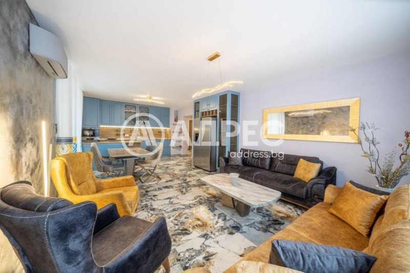 Ново, напълно обзаведено жилище, изпълнено по дизайнерски проект с функционални мебели и вградени уреди от висок клас. Разпределение: широко входно фоайе, просторна дневна с трапезария и кухня оборудвана с всичко необходимо, голяма южна тераса, две спални, баня с тоалетна, втора тоалетна и ниша с пералня и сушилня.