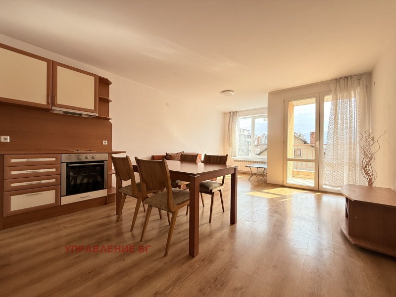 Напълно обзаведен тристаен апартамент със следното разпределение: входно антре, просторен хол с кухненски бокс и трапезария, две спални, баня с тоалетна, килер и две тераси.