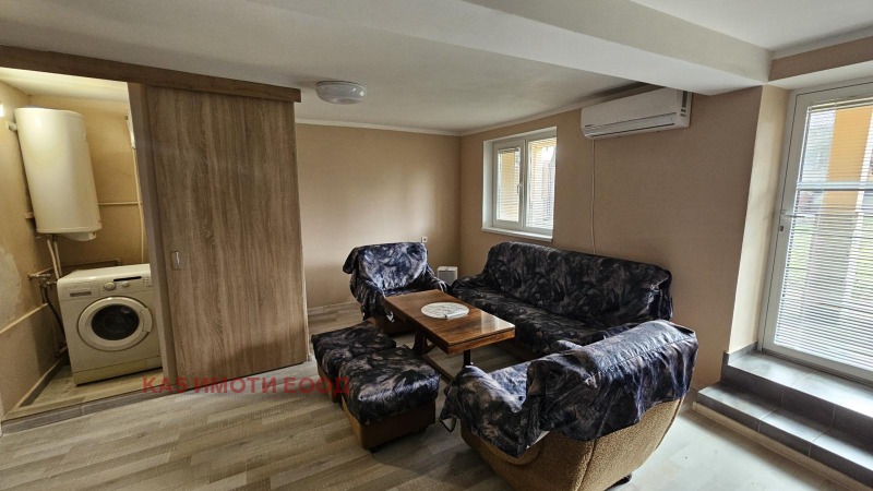 КА5 Имоти предлага етаж от къща в Требич с ползване на огромен двор. За наемане се изискват 2 депозита. Имотът разполага с печка, пералня и хладилник. Чудесно югоизточно изложение. Разпределение: Антре с коридор, баня с тоалетна, хол с камина, кухня, гостна и спалня. Отопление: Камина на водна риза и климатици. Паркиране: 1 паркомясто в двора на къщата.