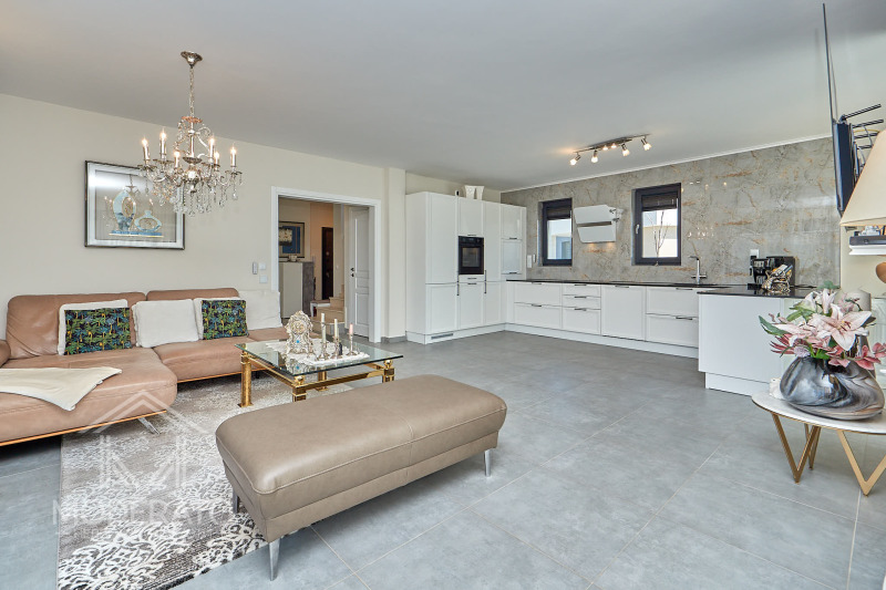 Имотът е напълно обзаведен. Тук ще се радвате на топли цветове и уютна обстановка с архитектура на италиански стил. Всекидневната предлага приятна зона за отдих с удобен голям и функционален диван, декоративни елементи от Marioni и голям телевизор. Италянска кухня е от масивно дърво с плот от черен гранит, напълно оборудван, със съдомиялна BOSCH, сместител Hansgrohe, електрическа система за филтриране от немско производство Falmec.