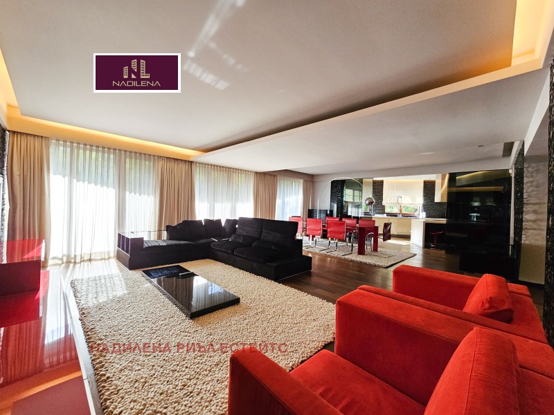 В КОМПЛЕКС МАКСИ! Отдава се под наем дизайнерски обзаведен апартамент с площ от 290м2, ет. 3/от 5, с асансьор, отоплението е на газ, но има поставено и алтернативно електрическо котле. Комплексът е изключително предпочитан, заради локацията-в близост до планината, контролирания достъп, многото зеленина, детски площадки, наблизо има Фантастико, Кауфланд, Френската детска градина и училище 'Виктор Юго' и т. н. Жилището е изпълнено с висок клас материали, поръчково обзавеждане и оборудване. Вътрешното разпределение е следното: антре, представителен хол, трапезарна част и кухня с маркови ел. уреди. От хола се излиза на една прекрасна веранда с гледка към зеленина. Отделно огромна родителска спалня със собствена гардеробна, баня с тоалетна, излаз на балкон, още 3 спални и 3 бани с тоалетни, едната спалня е също с балкон, мокро помещение. Навсякъде са поставени модерни осветителни тела и аксесоари. Като цяло имотът е изключително стилно направен, с много вкус и усет към всички детайли, освен това предлага истинско спокойствие и хубава гледка отвсякъде. Има възможност да се наеме огромен гараж за 2 коли със складова част, като за удобство има и директна връзка към сградата-200EUR. Собственост е на юридическо лице. За допълнителни въпроси се обръщайте към Надя Антова-088/9999 413, 0888/788 420, Васил-0899/18 35 80, Елена-0898/60 55 33
