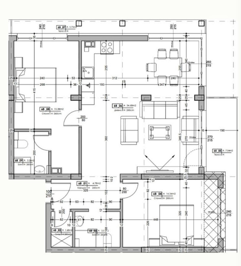 С площ от 120 кв. м. Разпределението включва просторна дневна с кухня и трапезария, две спални, като едната разполага със собствена баня и дрешник, втора баня с тоалетна, както и отделно мокро помещение. Жилището предлага функционалност, комфорт и прекрасна възможност както за лично ползване, така и за инвестиция.