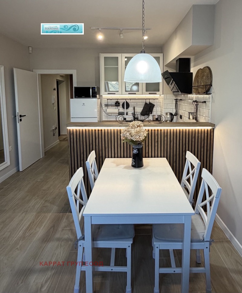 Представяме уютен едностаен апартамент в комплекс Фонтаните, в Младост 4. Жилището в новата сграда, с контрол на достъпа, напълно обзаведено и оборудвано със всичко необходимо за живеене. Кухня обурдвана с нова техника: котлон с 2 зони, абсорбатор, вградена фурна, хладилник, съдомиялня, микровълнова, комплект посуда, трапезна маса със столове, дневна част с удобен ъглов диван, който се разтяга на удобна спалня, телевизор, климатик. В банята пералня със сушилня и проточен бойлер в случаи, ако има профилактика от ТЕЦ.