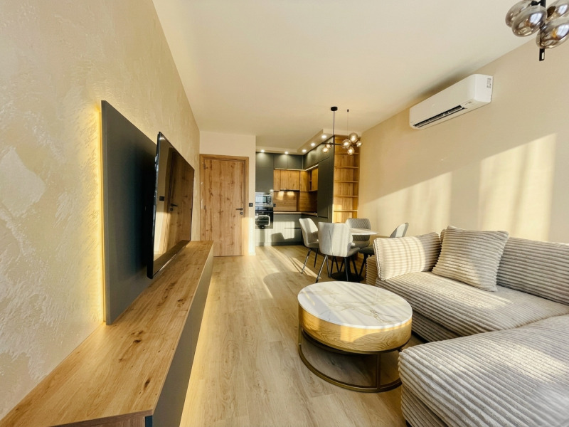 Апартаментът е 65 кв. м. , разположен на 4-ти етаж, с отлично изложение изток юг, което гарантира светлина и уют през целия ден. Обзаведен е с мебели по поръчка и електроуреди от висок клас, а отоплението е решено с инверторни климатици. Разпределението е практично и комфортно входно антре, просторна дневна с кухненски бокс и трапезария, самостоятелна спалня, баня с тоалетна и уютна тераса.