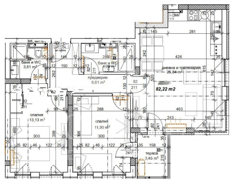 Разпределение - Светъл просторен хол, с кът за хранене и кухненски кът, с излаз на тераса, 2 НЕПРЕХОДНИ спални, с излаз и от двете стаи на втора прекрасна просторна тераса, 2 бани с тоалетна, функционално входно антре, мазе!
