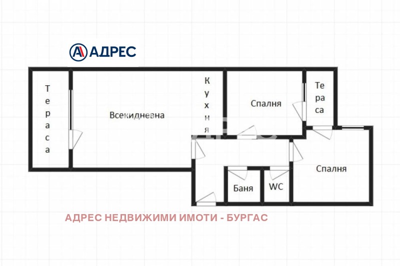 Имотът се състои от хол с кухня с площ 36кв. м. ,две спални, две бани с тоалетни, коридор и две тераси.