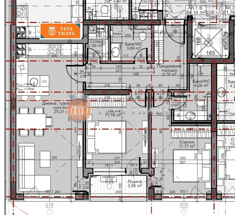 Агенция ТЕРА ТИАРА продава БЕЗ КОМИСИОННО ТРИСТАЕН апартамент в новостроящата се сграда пред АКТ 15, разположена в полите на Витоша в кв. Младост 4. Жилището се намира на 2 етаж от девет и е с функционално вътрешно разпределение на площ от 99, 14 кв. м. (застроена площ 84, 14 кв. м. + 15, 00 кв. м. общи части) и се състои от Дневна с кухня и трапезария ( 25, 21 кв. м. ), Спалня ( 11, 77 кв. м. ) със собствена Баня с тоалетна ( 4, 26 кв. м. ), втора Спалня ( 11, 74 кв. м. ), втора Баня с тоалетна ( 3, 69 кв. м. ), Складово помещение, Преддверие и Балкона. Изложение: изцяло Югоизток. Отопление: ГАЗ. За удобството и комфорта на бъдещите собственици, в сградата има възможност за покупка на подземни и надземни гаражи и паркоместа, осигурено е видеонаблюдение и контрол на достъпа. Очакван Акт 16 ноември 2026 годината.