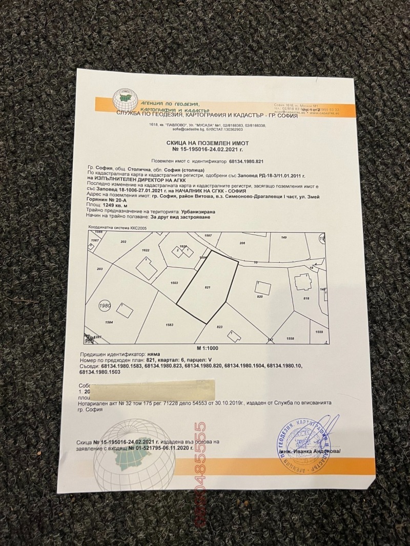 Парцелът се намира в тихата част на в. з Драгалевци-Симеоново, на ул. Змей Горянин 20А. От имота се открива чудесна панорамна гледка към София, а над него е парк Витоша. Лицето е 21м и е на асфалтирана улица. Има ток, вода, канал и газово отклонение в имота! Параметрите позволяват построяване на една или двe къщи с РЗП 1000 м2 или кооперация с апартаменти и 12 паркоместа под сградата!