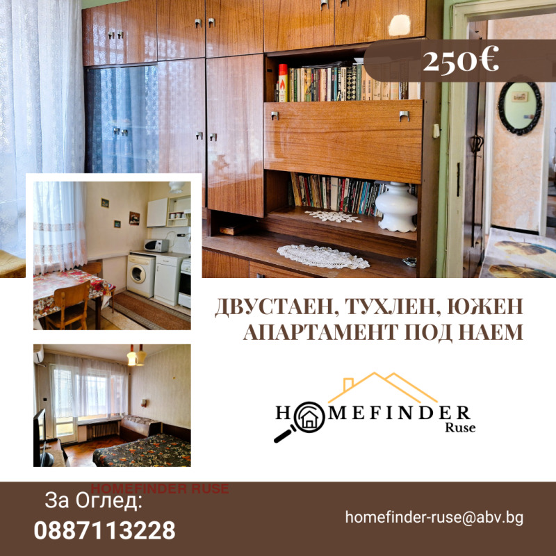 'Хоумфайндър Русе' отдава двустаен апартамент в кв. Здравец, Олимп. Жилището е на втори етаж в осеметажна, монолитна сграда. Имотът е обзаведен, отоплява се с климатици, мебелировката е запазена. Апартаментът е среден и изложението е изцяло южно. Площта е разпределена между кухня, спалня, хол, баня и тоалетна заедно и тройна, южна тераса. Входът се заключва, има асансьор. Районът е озеленен, пред входа има спирка на градския транспорт. В близост има Lidl, аптека под блока, магазини. Паркинги пред и зад блока.