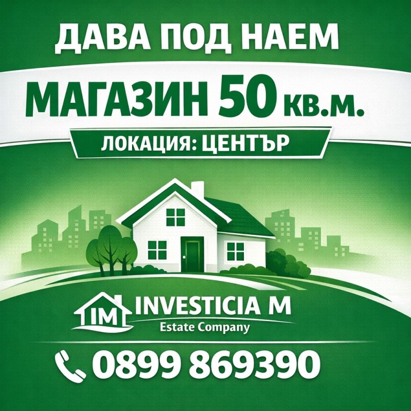 Агенция Инвестиция М, дава под наем помещение за промишлени стоки от 50 кв. м. , в супер Център. Помещението се състои от: зала за клиенти, малък склад и санитарен възел. Търговски обект е подходящ за магазин, офис, масажно студио, не се отдава за фризьорски салон. Помещението е боядисано, подова настилка теракот и поставена санитария в тоалетната. Отоплението е с климатик.