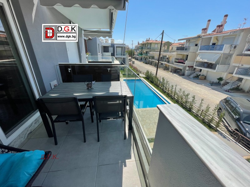 Продава се светъл и слънчев апартамент в Паралия Офринио, Северна Гърция, в нов малък комплекс със собствен басейн.
