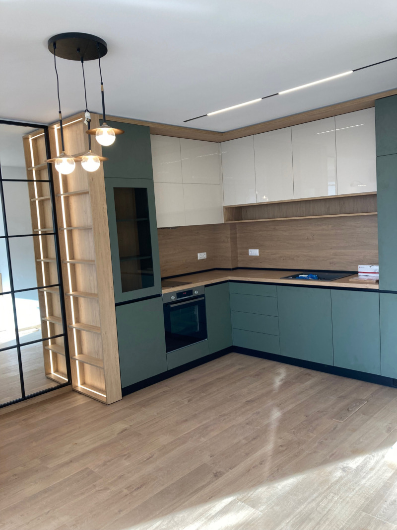 Южен панорамен двустаен апартамент, напълно обзаведен по дизайнерски проект с мебели висок клас. С ПАРОМАСТО, включено в наемната цена. Отопление -газово котле. Огледи - с ключ.